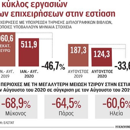 Τον πλέον –υποτίθεται– τουριστικό μήνα, τον Αύγουστο, ο κύκλος εργασιών των επιχειρήσεων εστίασης με υποχρέωση τήρησης διπλογραφικών βιβλίων διαμορφώθηκε σε 124,3 εκατ., χαμηλότερος κατά 33,6% σε σύγκριση με τον Αύγουστο του 2019. Η μεγαλύτερη μείωση μάλιστα, 68,9%, καταγράφηκε στη Μύκονο και η μικρότερη στην Εύβοια (1,8%). Ενδιαφέρον παρουσιάζει το γεγονός ότι στη Φθιώτιδα καταγράφηκε αύξηση του τζίρου κατά 25,3%. «Στους προορισμούς κοντά στην Αττική, οι οποίοι είναι προσβάσιμοι οδικώς, όπως η Εύβοια και η Πελοπόννησος, υπήρχε μεγαλύτερη τουριστική κίνηση –κυρίως εσωτερικός τουρισμός και ολιγοήμερες εξορμήσεις– και η μείωση του τζίρου ήταν χαμηλότερη», επισημαίνει στην «Κ» ο πρόεδρος της Πανελλήνιας Ομοσπονδίας Εστιατορικών και Συναφών Επαγγελμάτων (ΠΟΕΣΕ) Γιώργος Καββαθάς. Προσθέτει, ωστόσο, ότι ήδη στην Αττική, όπου τα εστιατόρια είναι υποχρεωμένα να κλείνουν τα μεσάνυχτα, έχει επέλθει επιπλέον μείωση του τζίρου της τάξεως του 15%-20%.