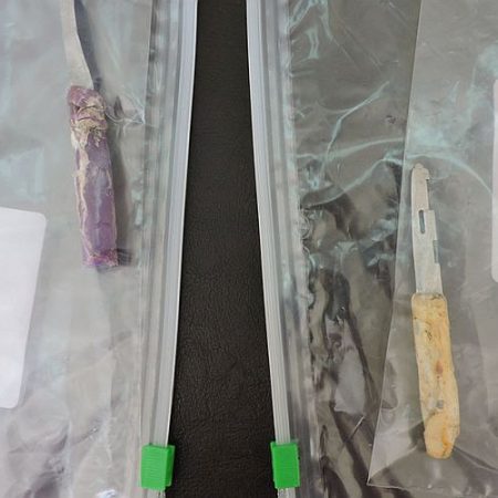 - – Επιμελώς κρυμμένα σε μεταλλική επιφάνεια σε κοινόχρηστο χώρο: Πιστόλι με γεμιστήρα 6 φυσιγγίων, μαχαίρι και αυτοσχέδια νάιλον συσκευασία με ναρκωτική ουσία, πιθανόν ηρωίνη, σε μορφή βράχου, συνολικού μικτού βάρους 9,1 γραμμαρίων.