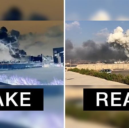 Σε βίντεο που αρχικά είχαν τραβηχτεί από το CNN και από αυτόπτες μάρτυρες στην πρωτεύουσα του Λιβάνου, έχει δημιουργηθεί η εικόνα ενός μοβ σύννεφου καπνού, μέσω της τεχνικής του «αρνητικού» στην εικόνα του βίντεο. Επιπλέον, έχει προστεθεί ένα αντικείμενο, το οποίο θυμίζει βαλλιστικό πύραυλο.