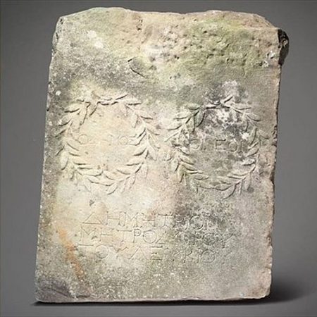 Στην πλάκα είναι χαραγμένη μια ελληνική επιγραφή, δίνοντας στοιχεία για την προέλευσή της και χρονολογείται από τον δεύτερο αιώνα μ.Χ.. Η επιγραφή λέει: «Ο δήμος (και) οι νέοι (τιμούν) τον Δημήτριο του Μητροδώρου του Λεύκιου».