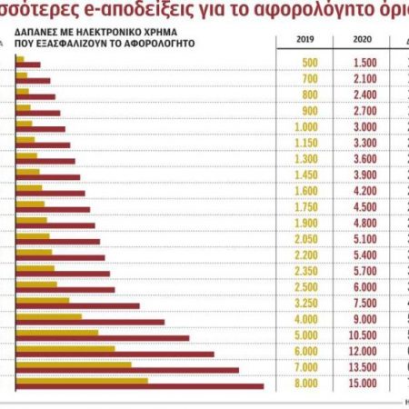 • Για εισόδημα 30.000 ευρώ: σήμερα απαιτούνται 4.000 ευρώ ηλεκτρονικών δαπανών, ενώ την επόμενη χρονιά θα χρειαστούν 9.000 ευρώ.