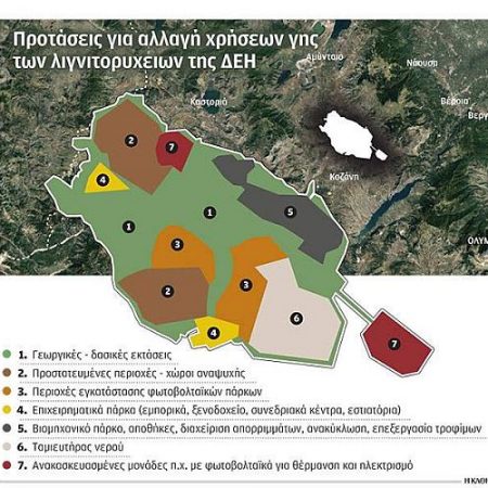 Η Παγκόσμια Τράπεζα προτείνει επίσης συγκεκριμένες χρήσεις γης για την περιοχή όπου βρίσκονται σήμερα τα ορυχεία λιγνίτη και κυριαρχεί το γκρίζο του άνθρακα. Ετσι, με βάση την πρόταση, εκεί όπου χάσκουν σήμερα οι βαθιές τάφροι του νότιου και του νοτιοδυτικού εξορυκτικού πεδίου θα μπορούσαν να γίνουν ταμιευτήρες νερού, λίμνες δηλαδή, με την ανακατεύθυνση υδάτων ποταμών. Γύρω γύρω θα υπάρχουν δασικές εκτάσεις. Στο κέντρο της περιοχής προτείνεται να διατεθούν εκτάσεις για καλλιέργειες, αλλά και εκτάσεις για την εγκατάσταση φωτοβολταϊκών πάρκων. Ακόμη, προβλέπεται η διαμόρφωση δύο προστατευόμενων περιοχών, η μία μεταξύ της μονάδας Πτολεμαΐδα 5 και της κοινότητας Αγίου Χριστοφόρου και η δεύτερη κοντά στο νοτιοδυτικό εξορυκτικό πεδίο, βόρεια της μονάδας της Καρδιάς. Δίπλα σε αυτές τις περιοχές προτείνεται η ανάπτυξη δύο πάρκων, για ήπιες επιχειρηματικές δραστηριότητες, όπως εμπορικά καταστήματα, γραφεία, εστιατόρια και ξενοδοχεία. Στα βορειοανατολικά, προτείνεται να δημιουργηθεί ένα βιομηχανικό πάρκο με ελαφρές μεταποιητικές βιομηχανίες, αποθήκες, ανακύκλωση και διαχείριση απορριμμάτων κ.α. Εκεί όπου υψώνονται σήμερα επιβλητικά τα φουγάρα της μονάδας του Αγίου Δημητρίου, αλλά και στην περιοχή όπου κατασκευάζεται η Πτολεμαΐδα 5, προτείνεται η εγκατάσταση πάνελ για την παραγωγή ηλεκτρικής ενέργειας και θέρμανσης νερού, προκειμένου να συνεχίσουν οι κάτοικοι να έχουν τηλεθέρμανση.