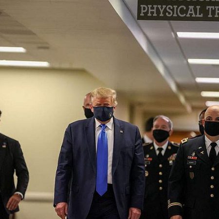 Για πρώτη φορά, ο πρόεδρος Ντόναλντ Τραμπ έκανε δημόσια εμφάνιση φορώντας μάσκα προστασίας χθες Σάββατο – μπλε σκούρα με τον θυρεό του Λευκού Οίκου τυπωμένο πάνω της – στη διάρκεια επίσκεψής του στο στρατιωτικό νοσοκομείο Ουόλτερ Ριντ. Ο Τραμπ, ο οποίος συνεχίζει να υποβαθμίζει τη σοβαρότητα της επιδημιολογικής κατάστασης, απέφευγε ως χθες να κάνει χρήση αυτού του μέσου ατομικής προστασίας, όπως ακριβώς και πολλοί από τους οπαδούς του.