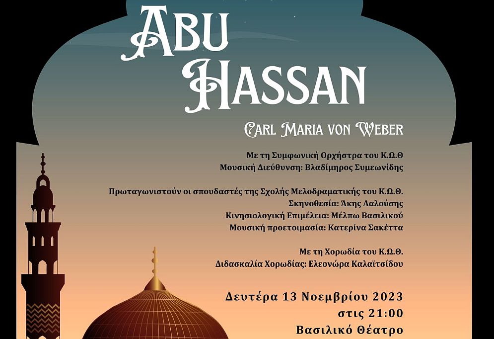 Την όπερα «Abu Hassan» του Carl Maria von Weber παρουσιάζει το Κρατικό Ωδείο Θεσσαλονίκης, τη Δευτέρα 13 Νοεμβρίου 2023, στις 21:00, στο Βασιλικό Θέατρο, στη Θεσσαλονίκη.