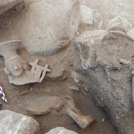 Επίσης, για πρώτη φορά ήρθαν στο φως, σφαιρικός αρύβαλλος από φαγεντιανή και πήλινα ειδώλια καθιστής σε θρόνο γυναικείας μορφής, που κρατά περιστέρι και ένθρονης Σφίγγας με λύρα. Βρέθηκαν δύο πλαστικά αγγεία με όρθια γυναικεία μορφή και με προτομή ανδρικής μυθικής μορφής με δορά ζώου στο κεφάλι, πιθανώς του Ηρακλή, που χρονολογούνται στα αρχαϊκά χρόνια.