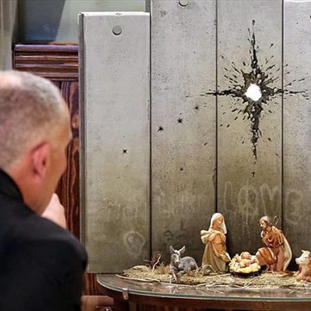 Μια φάτνη-μινιατούρα με το θείο βρέφος στο εσωτερικό, τη Μαρία και τον Ιωσήφ να στέκουν πλάι της, με φόντο τμήμα του τσιμεντένιου Τείχους του Ισραήλ, δημιουργία του Βρετανού καλλιτέχνη δρόμου Banksy, παρουσιάστηκε σε ξενοδοχείο της Βηθλεέμ, στην κατεχόμενη Δυτική Όχθη.