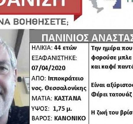Τραγική ήταν η κατάληξη για τον 44χρονο Αναστάσιο Πανίνιο, ο οποίος είχε εξαφανιστεί στις 7 Απριλίου από το Ιπποκράτειο νοσοκομείο, στη Θεσσαλονίκη.