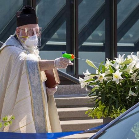 Ο αιδεσιμότατος Τίμοθι Πελκ, φορώντας μάσκα, ασπίδα προσώπου και γάντια ως επιπλέον μέτρα αυτοπροστασίας, εκτόξευε με νεροπίστολο αγιασμό σε κάθε αυτοκίνητο που σταματούσε μπροστά στα σκαλοπάτια του Αγίου Αμβροσίου στο Ντιτρόιτ.