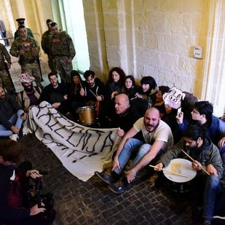 Περίπου 40 ακτιβιστές εισέβαλαν στο κτίριο αυτό του 16ου αιώνα στο κέντρο της Βαλέτας, αφού κατάφεραν να περάσουν από τους αστυνομικούς και τους στρατιώτες που το φυλούν από μία πλαϊνή είσοδο, κρατώντας τύμπανα, σφυρίχτρες, σημαίες και ντουντούκες.
