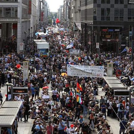 Με τίτλο «γιορτή της ελευθερίας και της ειρήνης», η συγκέντρωση στο Βερολίνο, στην οποία μετείχαν «ελεύθερα σκεπτόμενοι» πολίτες, αντιεμβολιαστές, συνωμοσιολόγοι ή και υποστηρικτές της άκρας δεξιάς, είναι η δεύτερη του είδους μέσα σε έναν μήνα και ανησυχεί τις αρχές.