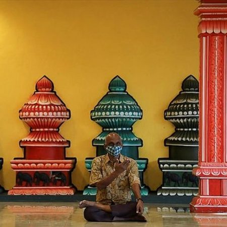 Ένας πιστός με μάσκα κάθεται στο εσωτερικό ναού, κατά τη διάρκεια του Ντιβάλι στην Κουάλα Λουμπούρ της Μαλαισίας.