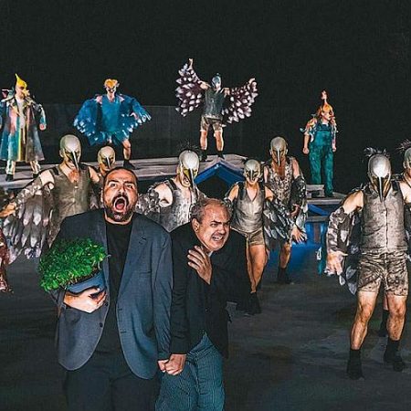 Γελάει ικανοποιημένος ο Γιάννης Ρήγας, σκηνοθέτης της παράστασης των αριστοφανικών «Ορνίθων» του Κρατικού Θεάτρου Βορείου Ελλάδος που έκαναν πρεμιέρα στο Θέατρο Δάσους και στις 7, 8 και 9 Αυγούστου θα πετάξουν μέχρι την Επίδαυρο. Με τις μυτερές μάσκες και τα μακριά πολύχρωμα φτερά τους, σκηνογραφικές λύσεις που εξασφαλίζουν αποστάσεις ασφαλείας μεταξύ των ηθοποιών.