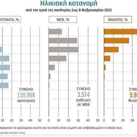 Συγκεκριμένα, από την αρχή της πανδημίας έως σήμερα, οι αριθμοί δείχνουν τα εξής: Τα περισσότερα κρούσματα έχουν σημειωθεί στις ηλικίες 40-49 και έπονται οι ηλικίες 50-59, μετά οι 20-29 και ακολούθως οι 30-39. Και όμως, αυτό δεν αποτυπώνεται σε ΜΕΘ και θανάτους, που πρώτες είναι μακράν οι ηλικίες 60 και άνω. Συγκεκριμένα όσον αφορά τις ΜΕΘ, πρώτη σε εισαγωγή είναι η ηλικιακή ομάδα 60-69, δεύτερη η 70-79 και τρίτη η 80 και άνω.