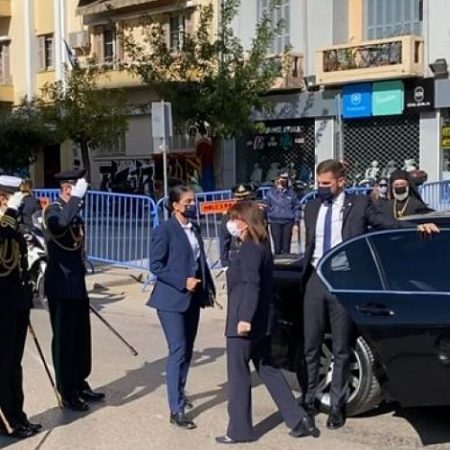 Η κ. Σακελλαροπούλου έφτασε στις 13.00 έξω από το ναό του Αγίου Δημητρίου, φορώντας μάσκα, όπως και τα μέλη της ηγεσίας των Ενόπλων Δυνάμεων που τη συνόδευαν.