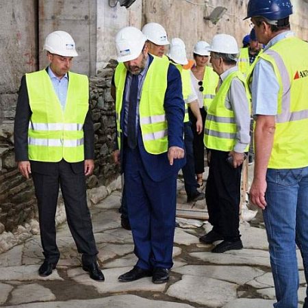 Η επίσκεψη συνεχίστηκε στο εργοτάξιο του σταθμού Αγίας Σοφίας, με τον Γενικό Γραμματέα Υποδομών να επιθεωρεί εργασίες κατασκευής των μόνιμων επενδύσεων οπλισμένου σκυροδέματος της Βόρειας και Νότιας πρόσβασης του σταθμού, καθώς και τις εργασίες τοιχοποιίας που πραγματοποιούνται αυτή την περίοδο στο επίπεδο έκδοσης εισιτηρίων.