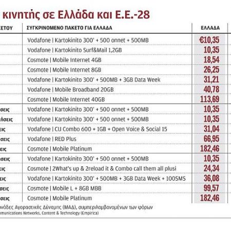 Στο μεταξύ, προχθές (19 Δεκεμβρίου) η Ευρωπαϊκή Επιτροπή παρουσίασε τη νέα έκθεση για τις χρεώσεις κινητής στην Ενωμένη Ευρώπη των «28». Η έκθεση καταρτίστηκε από τη γερμανική εταιρεία Empirica για λογαριασμό της Κομισιόν και παρουσιάζει την Ελλάδα ως τη δεύτερη πιο ακριβή χώρα στην Ε.Ε.-28, πίσω από τη Σλοβακία. Οι χρεώσεις στην Ελλάδα, σύμφωνα με τα στοιχεία της έρευνας, ανάλογα με το εξεταζόμενο πακέτο, εμφανίζονται έως και πέντε φορές πιο υψηλές απ’ ό,τι είναι ο μέσος όρος της Ευρώπης.