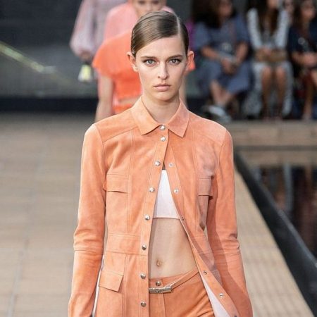 Σουέτ τζάκετ και hotpants πλημμύρισαν τη συλλογή του οίκου Longchamp, συμπεριλαμβανομένου αυτού του σε που συμπληρώνεται από πέδιλα με κορδόνια.