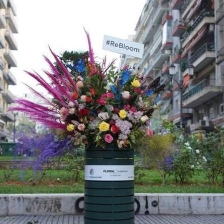 Με τεράστιες ανθοδέσμες από πολύχρωμα λουλούδια στολίστηκαν το Σάββατο δοχεία απορριμμάτων στο κέντρο της Θεσσαλονίκης.