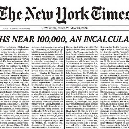 Δίπλα σε κάθε όνομα η ηλικία τους, και μία φράση για εκείνους αλιευμένη από τον επικήδειο του καθενός, μια πρόταση για ένα ιδιαίτερο χαρακτηριστικό τους ή μια σημαντική στιγμή τους, για να υπενθυμίζει στον αναγνώστη ότι δεν ήταν απλά ονόματα σε μία λίστα. «Οι θάνατοι πλησιάζουν τις 100.000 στις ΗΠΑ, μία ανυπολόγιστη απώλεια».