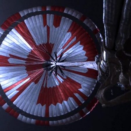 Καθώς το διαστημικό όχημα της NASA «Perseverance» εισερχόταν στην ατμόσφαιρα του Άρη, κάμερα του σκάφους κατέγραφε την ανάπτυξη του αλεξιπτώτου του, το οποίο ήταν διακοσμημένο με πορτοκαλιές και λευκές γραμμές.
