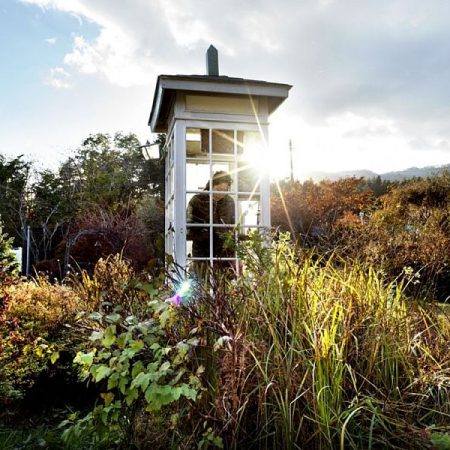 Κάτω από τις ανθισμένες κερασιές, μέσα σε ένα κήπο, ξεπροβάλλει ένας ολόλευκος τηλεφωνικός θάλαμος.