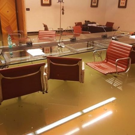 Ενώ τα μέλη του Συμβουλίου συζητούσαν τον προϋπολογισμό του 2020, σύμφωνα με όσα δημοσίευσε στο Facebook ο Αντρέα Ζανόνι, μέλος του Δημοκρατικού Κόμματος και εκλεγμένος δημοτικός σύμβουλος στην πόλη, άρχισαν να μπαίνουν νερά στον χώρο, περίπου στις 22:00.
