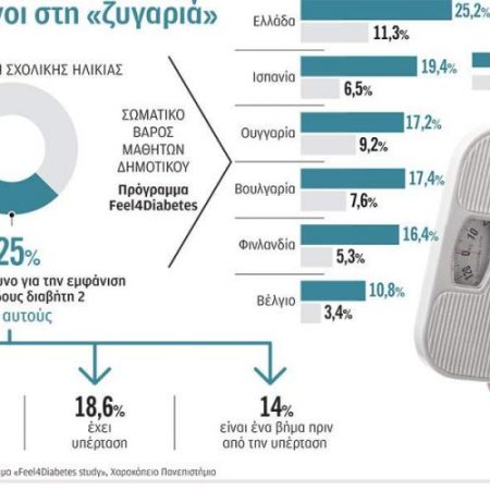 Η εσφαλμένη αντίληψη πολλών γονιών για το ιδανικό σωματικό βάρος που πρέπει να έχουν τα παιδιά, οι μεγάλες μερίδες της… γιαγιάς, αλλά και η απουσία χώρων που προάγουν τη σωματική δραστηριότητα, οδηγούν πολλά Ελληνόπουλα σε μια ζωή με καθημερινή «μάχη» με τη ζυγαριά. Ερευνα που έγινε στο πλαίσιο του ευρωπαϊκού προγράμματος Feel4Diabetes για την προώθηση υγιεινού τρόπου ζωής και την πρόληψη του διαβήτη, στην οποία συμμετείχαν παιδιά και οι οικογένειές τους από έξι χώρες ανέδειξε τα Ελληνόπουλα ως τα πλέον υπέρβαρα και παχύσαρκα, με το σχετικό ποσοστό να φτάνει το 36,5%. Οι υπέρβαροι γονείς έχουν συχνά και υπέρβαρα παιδιά, ωστόσο ακόμα και γονείς με φυσιολογικό βάρος «μπουκώνουν» τα παιδιά τους νομίζοντας εσφαλμένα ότι τα τρέφουν σωστά.