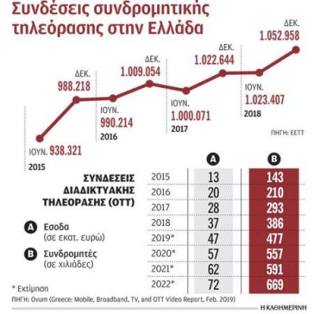 Τα στοιχεία για την αγορά της τηλεόρασης μέσω Διαδικτύου δείχνουν μια πολύ μεγάλη ανάπτυξη τα τελευταία χρόνια. Η Ovum αναφέρει ότι από 144.000 συνδρομητές στο τέλος το 2015, στο τέλος του 2018 ανήλθαν σε 385.000 και μέχρι το 2022 θα ανέλθουν σε 670.000. Η συγκεκριμένη αγορά, από 13 εκατ. ευρώ που ήταν το 2015, θα ξεπεράσει τα 70 εκατ. ευρώ το 2020. Παράγοντες εκτιμούν ότι η συγκεκριμένη αγορά μπορεί να είναι ακόμη μεγαλύτερη. Παρακολουθώντας την κίνηση του δικτύου της Netflix, θεωρούν ότι μπορεί να υπάρχουν πάνω από 600.000 συνδρομητές των υπηρεσιών Νetflix στην Ελλάδα. Ωστόσο, τα στοιχεία αυτά δεν επιβεβαιώνονται και αποτελούν κυρίως εικασίες, καθώς η αμερικανική επιχείρηση δεν διαθέτει στοιχεία για την Ελλάδα. Το μόνο δεδομένο είναι ότι η παραδοσιακή αγορά συνδρομητικής τηλεόρασης από το 2015 και μετά παραμένει σχεδόν «παγωμένη». Σύμφωνα με τα στοιχεία της Εθνικής Επιτροπής Τηλεπικοινωνιών και Ταχυδρομείων (ΕΕΤΤ), οι συνδέσεις (συνδρομές) συνδρομητικής τηλεόρασης, από 988.000 που ήταν στο τέλος του 2015, στο τέλος του 2018 ανήλθαν σε 1,05 εκατ., σημειώνοντας αύξηση 6,5%.