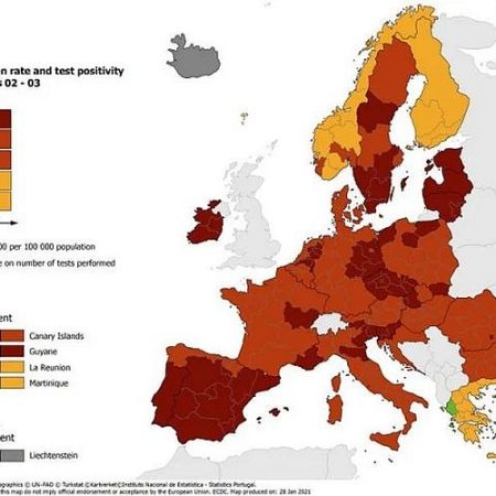 Υπενθυμίζεται ότι οι χάρτες του ECDC ανανεώνονται κάθε Πέμπτη, σύμφωνα με τη Σύσταση του Ευρωπαϊκού Συμβουλίου που έχει ως στόχο την εφαρμογή μιας συντονισμένης προσέγγισης μεταξύ των χωρών της ΕΕ όσον αφορά τον περιορισμό της ελεύθερης κυκλοφορίας για την αντιμετώπιση της πανδημίας.