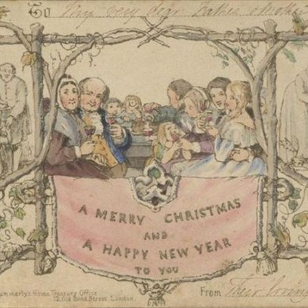 Σε σχέδιο του Χένρι Κόουλ και εικονογράφηση του Τζον Κάλκοτ, η ζωγραφισμένη στο χέρι κάρτα, η οποία δημιουργήθηκε την ίδια χρονιά που κυκλοφόρησε το έργο του Καρόλου Ντίκενς «Χριστουγεννιάτικη Ιστορία», δείχνει μια οικογένεια να απολαμβάνει ένα ποτήρι κρασί καθισμένη γύρω από το τραπέζι και συνοδεύεται από το μήνυμα: «Ευχές για Χαρούμενα Χριστούγεννα και Ευτυχισμένος ο Νέος Χρόνος».