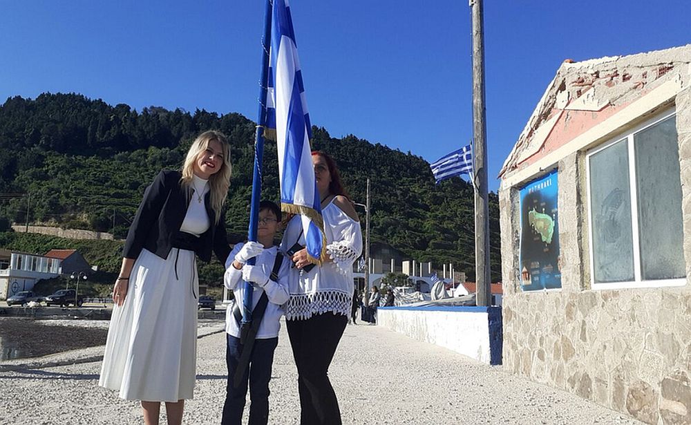 Ο μικρός Άγγελος, ντυμένος τσολιάς, και η λίγο μεγαλύτερη του Ιωάννα κράτησαν περήφανα την ελληνική σημαία ενώ στο πλευρό τους βρέθηκαν και μαθητές του Γυμνασίου της Πατμιάδας Σχολής, οι οποίοι ταξίδεψαν από την Πάτμο στο πλαίσιο των εορτασμών για την εθνική μας επέτειο.