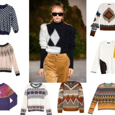 Γεωμετρικά σχέδια σε old school χρωματική παλέτα στα πλεκτά πουλόβερ που θα φορέσουμε με κοτλέ παντελόνια και δερμάτινες φούστες