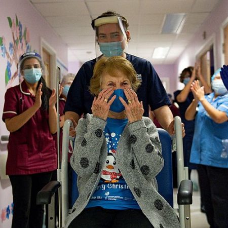 Το πρώτο εμβόλιο έγινε στην 90χρονη Μάργκαρετ Κίναν, λίγες ημέρες πριν τα γενέθλια της. Η ηλικιωμένη κυρία, που χειροκροτήθηκε από το νοσηλευτικό προσωπικό κατά την έξοδο της, έλαβε την πρώτη από τις 800.000 δόσεις του εμβολίου της Pfizer/BioNTech που θα γίνουν σε γιατρούς, νοσηλευτικό προσωπικό, ευπαθείς ομάδες και ηλικιωμένους τις προσεχείς ημέρες. Έως το τέλος του μήνα αναμένονται ακόμα 4 εκατομμύρια δόσεις στη Βρετανία.